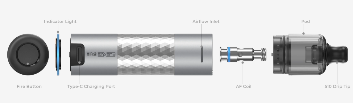 Flexus Stik, 1200 mAh dahili bataryaya sahiptir ve hem auto-draw hem de butonla ateşleme özelliği sunar. Kullanıcılar, 3 kademeli watt ayarı ile buhar deneyimlerini istedikleri seviyeye göre özelleştirebilir. Cihaz, Type-C 1A hızlı şarj desteği sayesinde kısa sürede şarj olur.