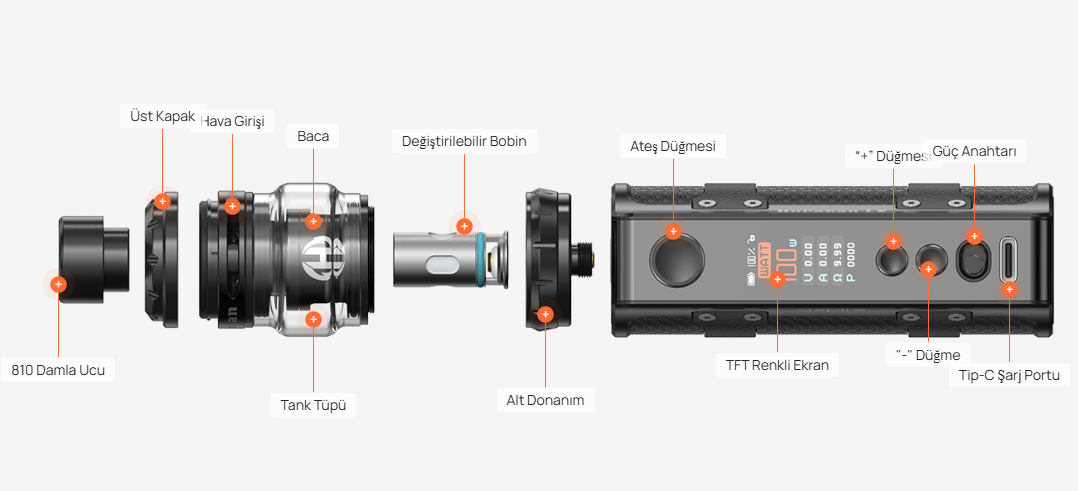 • Güçlü performans: 100W’a kadar esnek çıkış aralığı ile hem aroma hem de bulut performansında üst düzey verim.