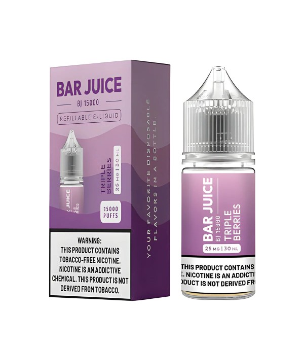 Bar Juice Triple Berries Salt Likit, çilek, yaban mersini ve böğürtlen aromalarının birleşimiyle yoğun meyve tadı sunan tatlı ve ferah bir elektronik sigara likitidir. 50VG / 50PG oranı sayesinde dengeli aroma ve pürüzsüz içim sağlar. 30 mL şişede; 25 mg ve 50 mg nikotin seçenekleriyle üretilmiştir.