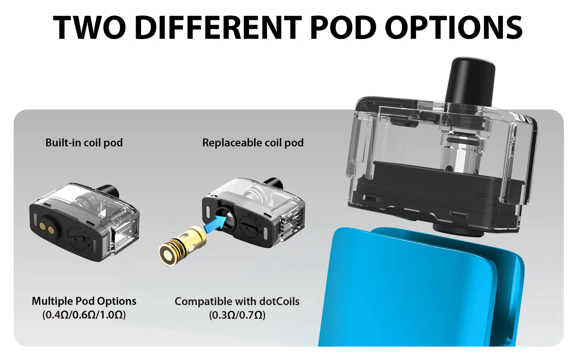 • Pod Direnç Seçenekleri: 0.3 Ohm, 0.7 Ohm, 0.9 Ohm (DotCoil pod’lar)