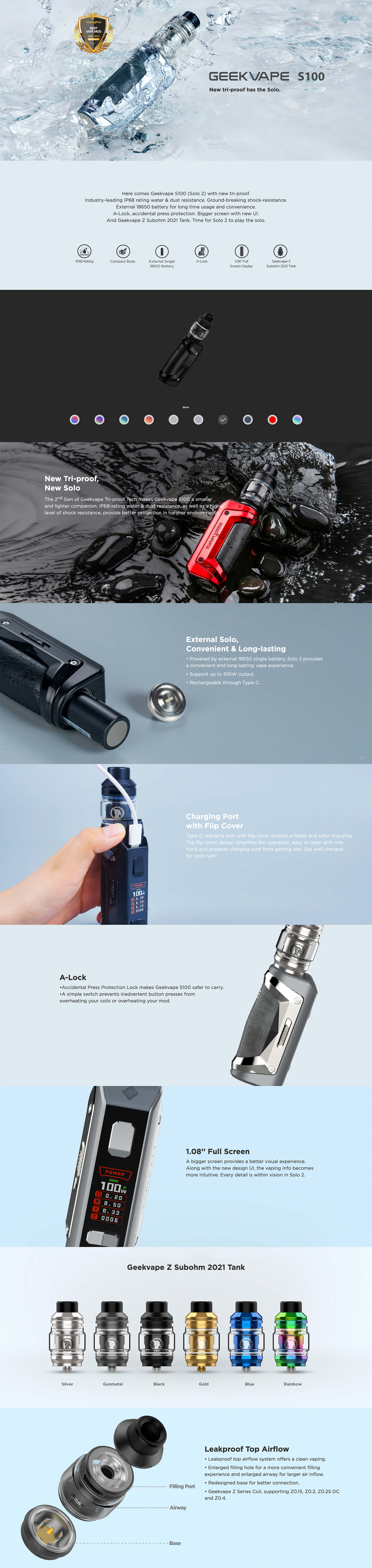GeekVape Aegis Solo 2 Kit, harici 18650 pil ile çalışır ve 100W’a kadar çıkış gücü sunar. A-Lock özelliği sayesinde, yanlışlıkla ateşleme riskine karşı koruma sağlar.