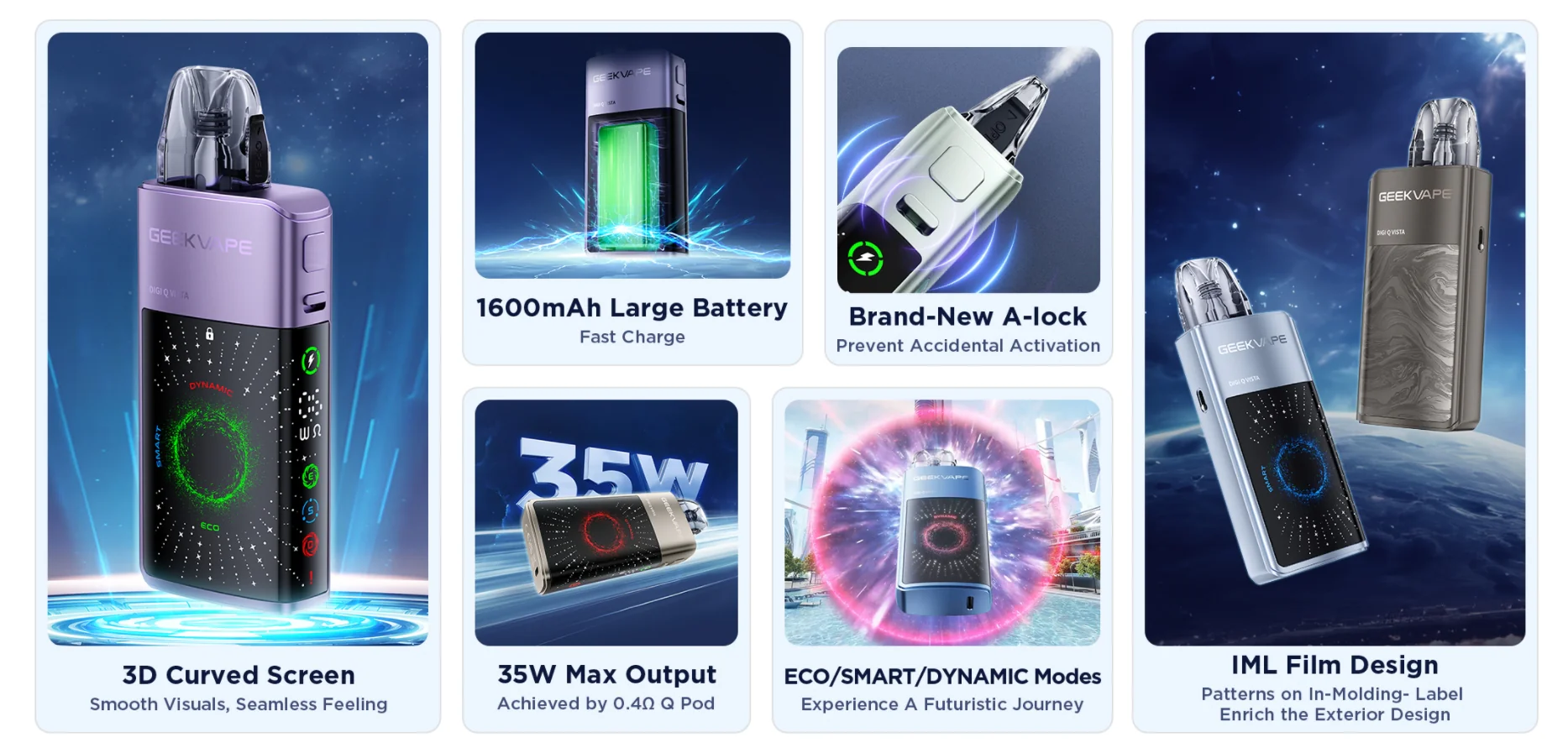 GeekVape Digi Q Vista Pod Kit, 1600mAh batarya, 3D kavisli ekran ve üç performans modu (ECO, SMART, DYNAMIC) ile estetik ve işlevselliği birleştirir. 0.6 Ohm ve 0.8 Ohm pod seçenekleri, yan hava akışı kontrolü ve 35W’a kadar çıkış gücü ile MTL ve RDL içim tarzlarını destekler. Renk seçenekleri ve fiziksel “A-lock” kilidiyle hem görsel zevk hem güvenlik sunan modern bir cihazdır.