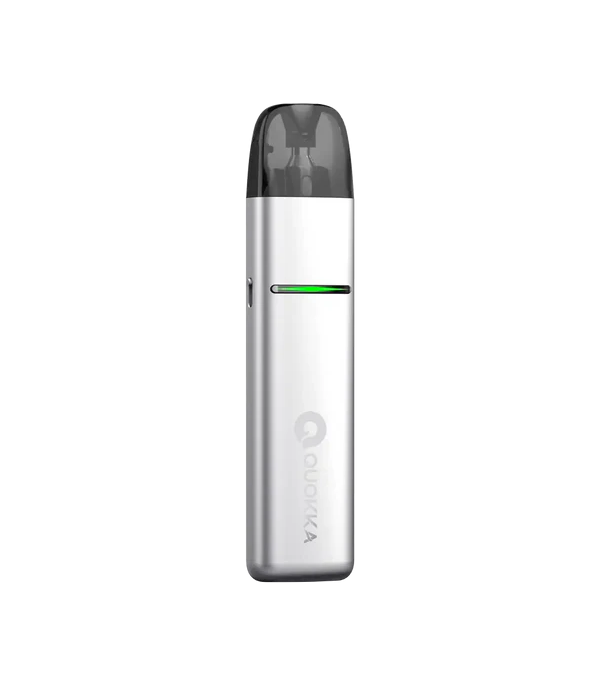 Hayati Quokka Elite Pod Mod gümüş renkli, yeşil ışıklı, kompakt elektronik sigara.