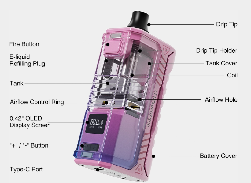 Lost Vape Centaurus G80 AIO Vape Kit, 5-80W çıkış gücü, değiştirilebilir 18650 bataryası ve UB Ultra coil sistemi ile güçlü buhar ve aroma deneyimi arayanlar için yüksek performanslı bir cihazdır. Yan dolum pod/tank sistemi, OLED ekran ve metal gövde ile estetik ve kullanışlı bir vaping deneyimi sunar.