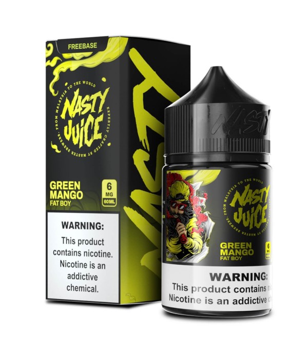 Nasty Green Mango Fat Boy Likit, olgunlaşmamış yeşil mangonun ekşi ve tatlı notalarını bir araya getiren benzersiz bir tropikal lezzet sunar.