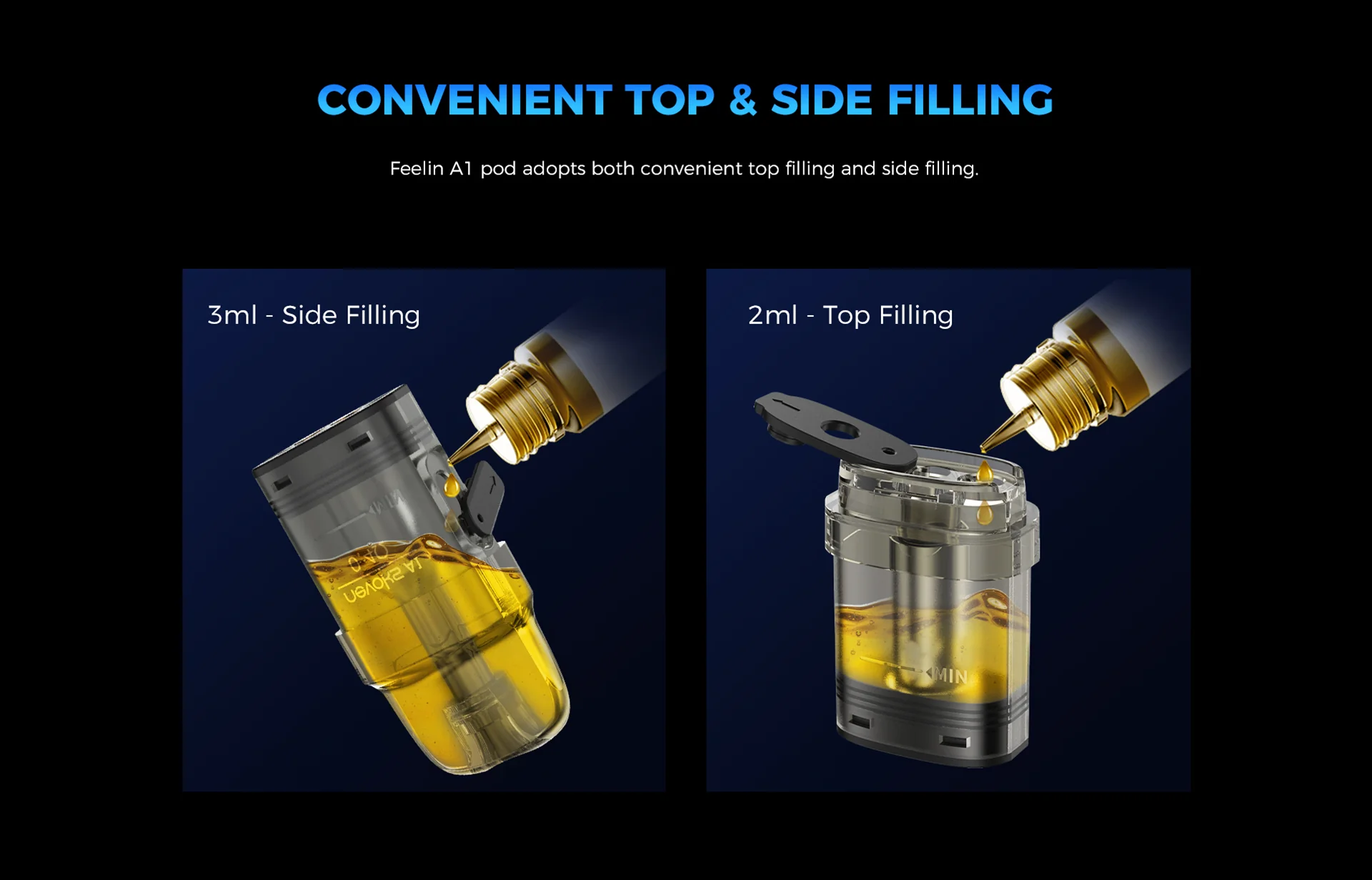 Feelin A1, hem yeni başlayanlar için kolay kullanım sunar hem de sıklıkla dışarıda olan ve taşınabilir, pratik cihaz arayan deneyimli kullanıcılar için mükemmeldir. 30W çıkışı ve 2.6 ml pod kapasitesi ile aroma ve buhar dengesini korur.