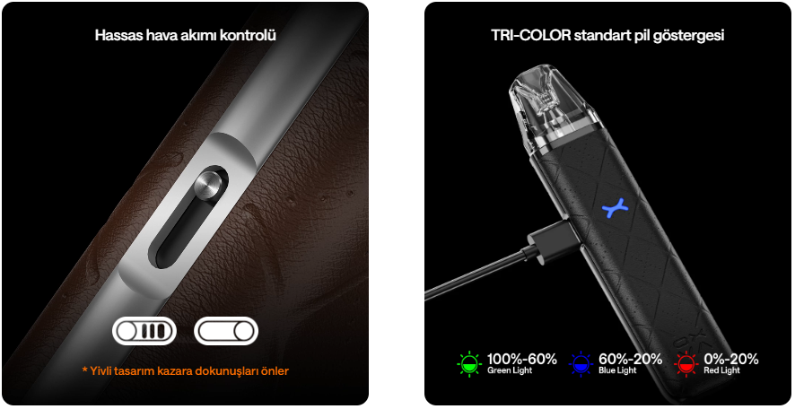 • Uyumlu direnç seçenekleri: 0.4 Ohm, 0.6 Ohm, 0.8 Ohm, 1.2 Ohm pod’lar — farklı çekim stillerine uygunluk.