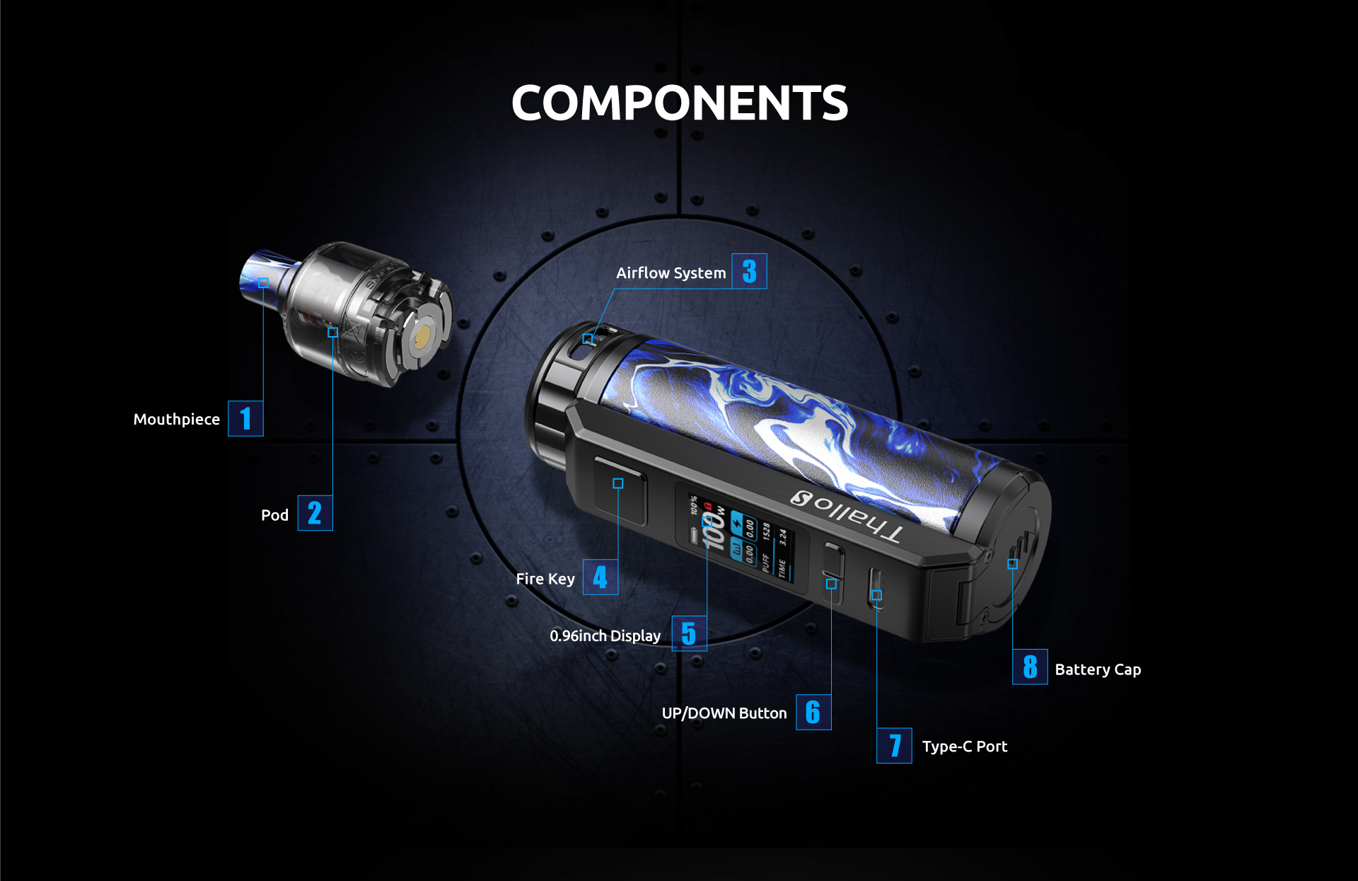 Thallo S’in dış tasarımı, dayanıklılık ve estetik açısından mükemmel bir denge sağlıyor. Çinko alaşımı ve deri detaylar, cihaza hem sağlam hem de zarif bir görünüm kazandırıyor. Ergonomik yapısı sayesinde elde rahat bir tutuş sağlayan bu cihaz, taşınabilirliği ve şıklığı ile de dikkat çekiyor. Üzerindeki 0.96 inç TFT ekranı, kullanıcıların watt ayarları, pil seviyesi ve coil direnci gibi bilgileri kolayca takip etmesine olanak tanıyor.