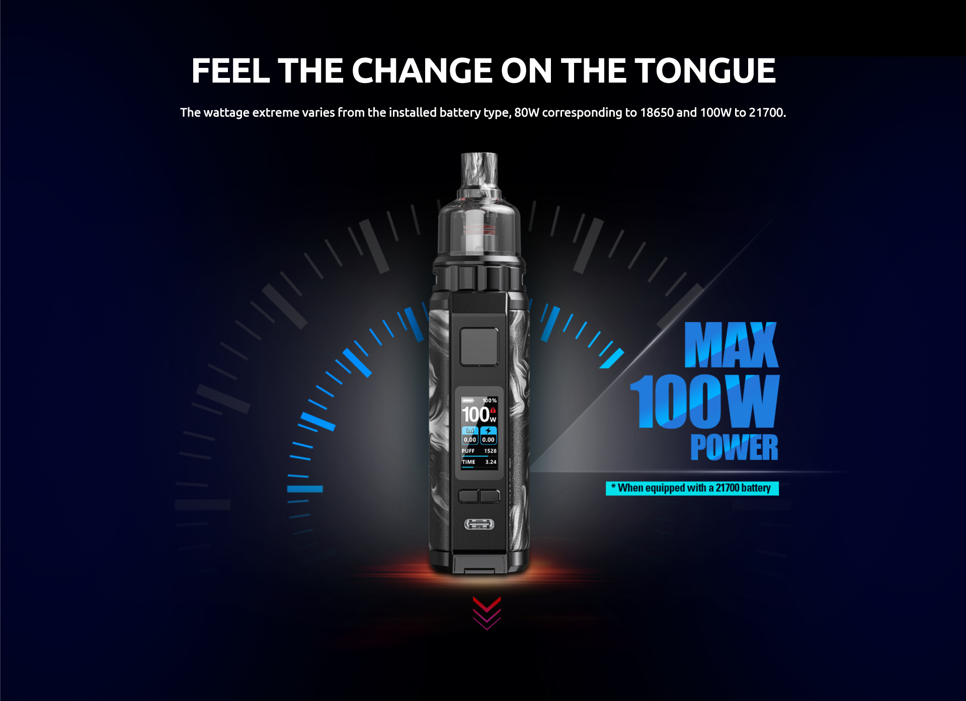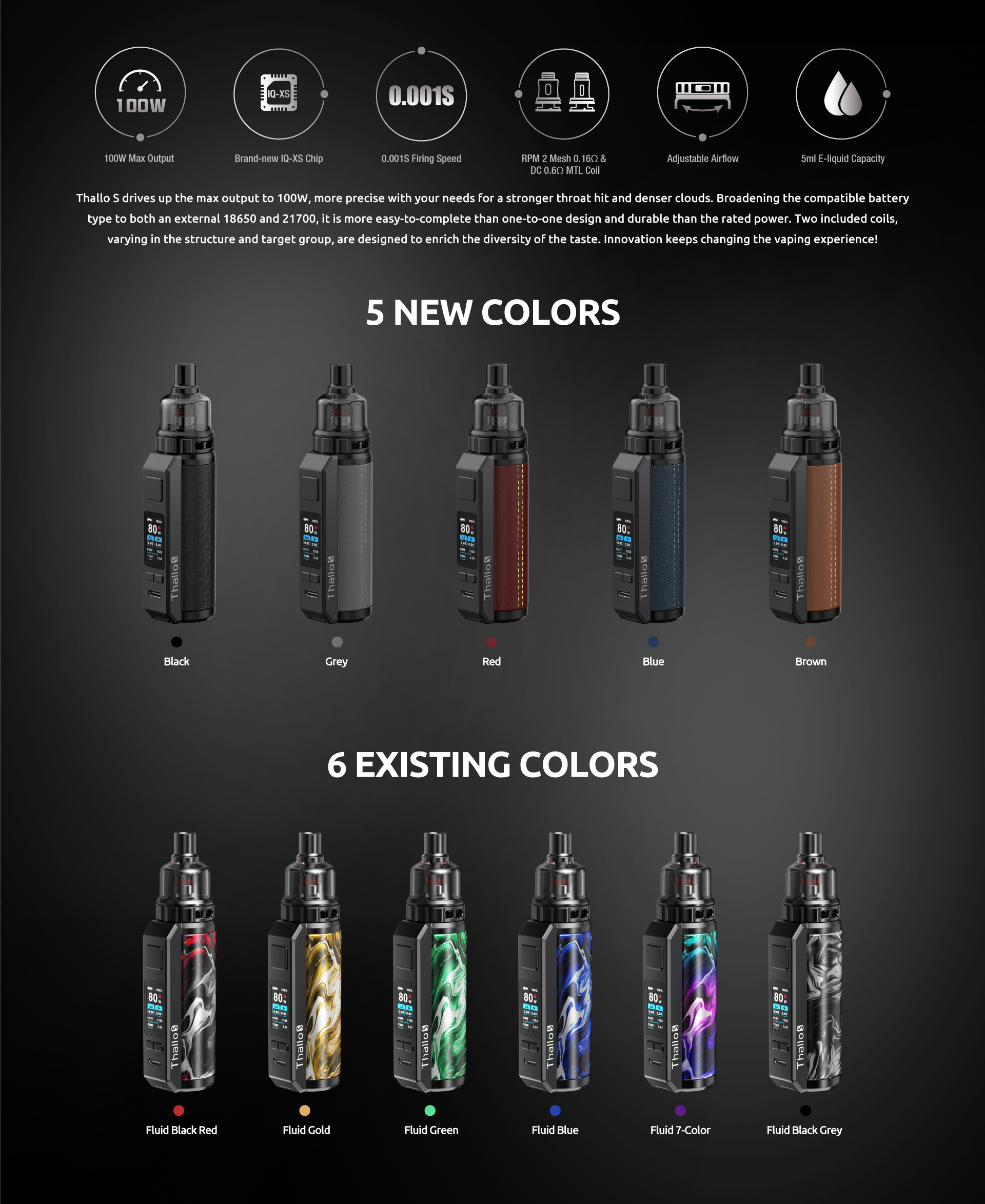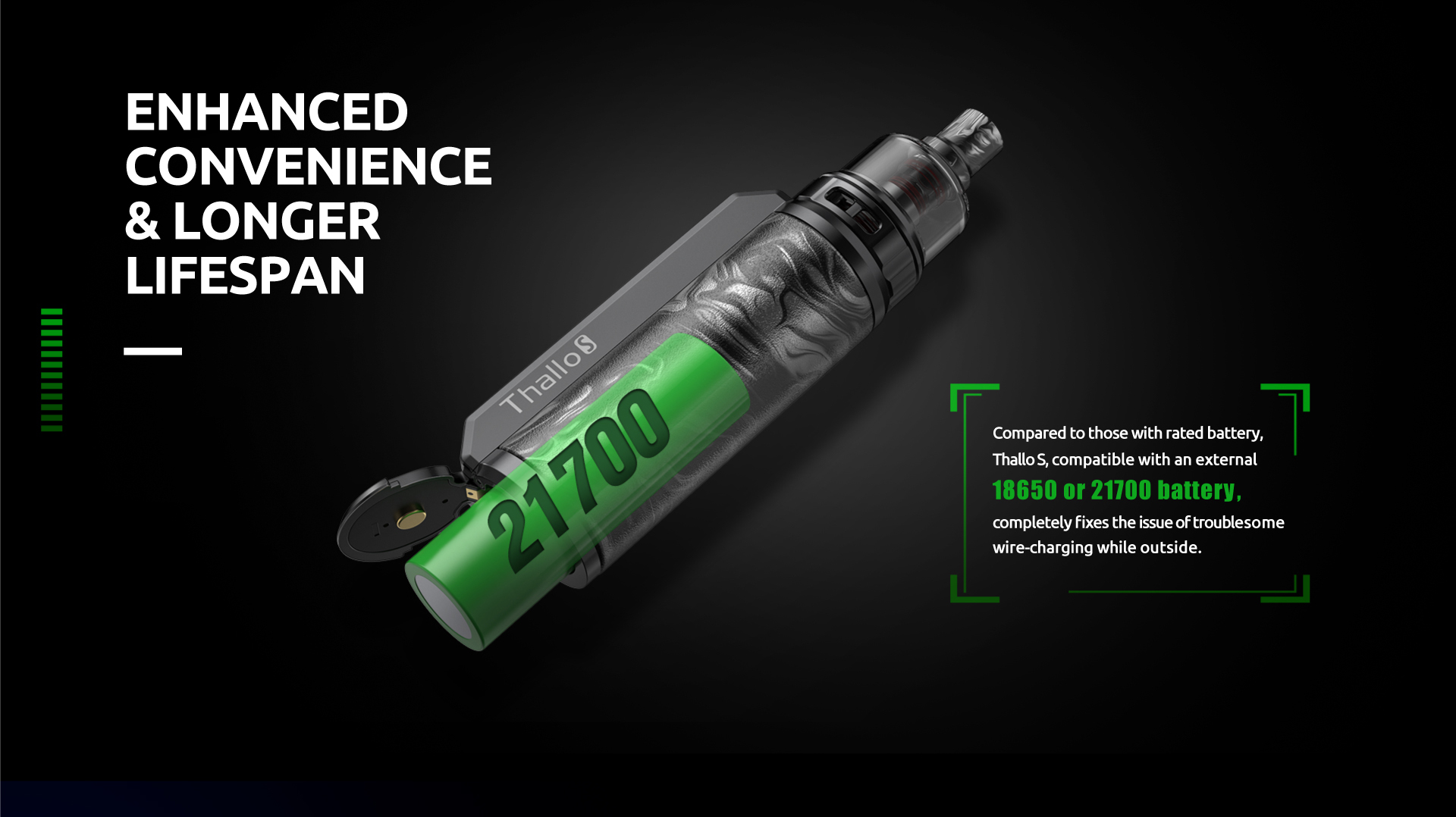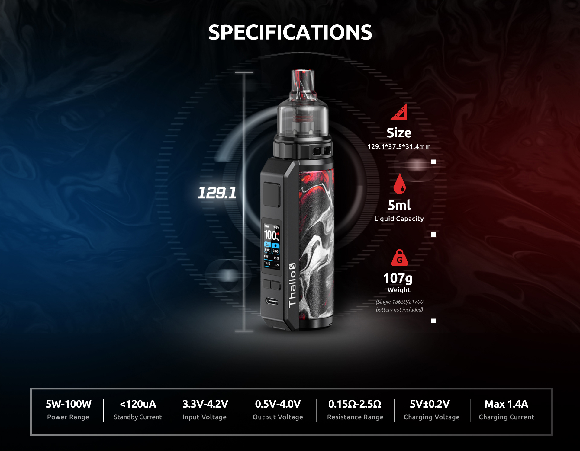 Smok Thallo S Pod Mod, harici 18650 veya 21700 pil ile çalışan bu cihaz, 1-100 watt arasında ayarlanabilir çıkış gücü sunarak kullanıcıların hem güçlü hem de esnek bir kullanım deneyimi yaşamasını sağlıyor.