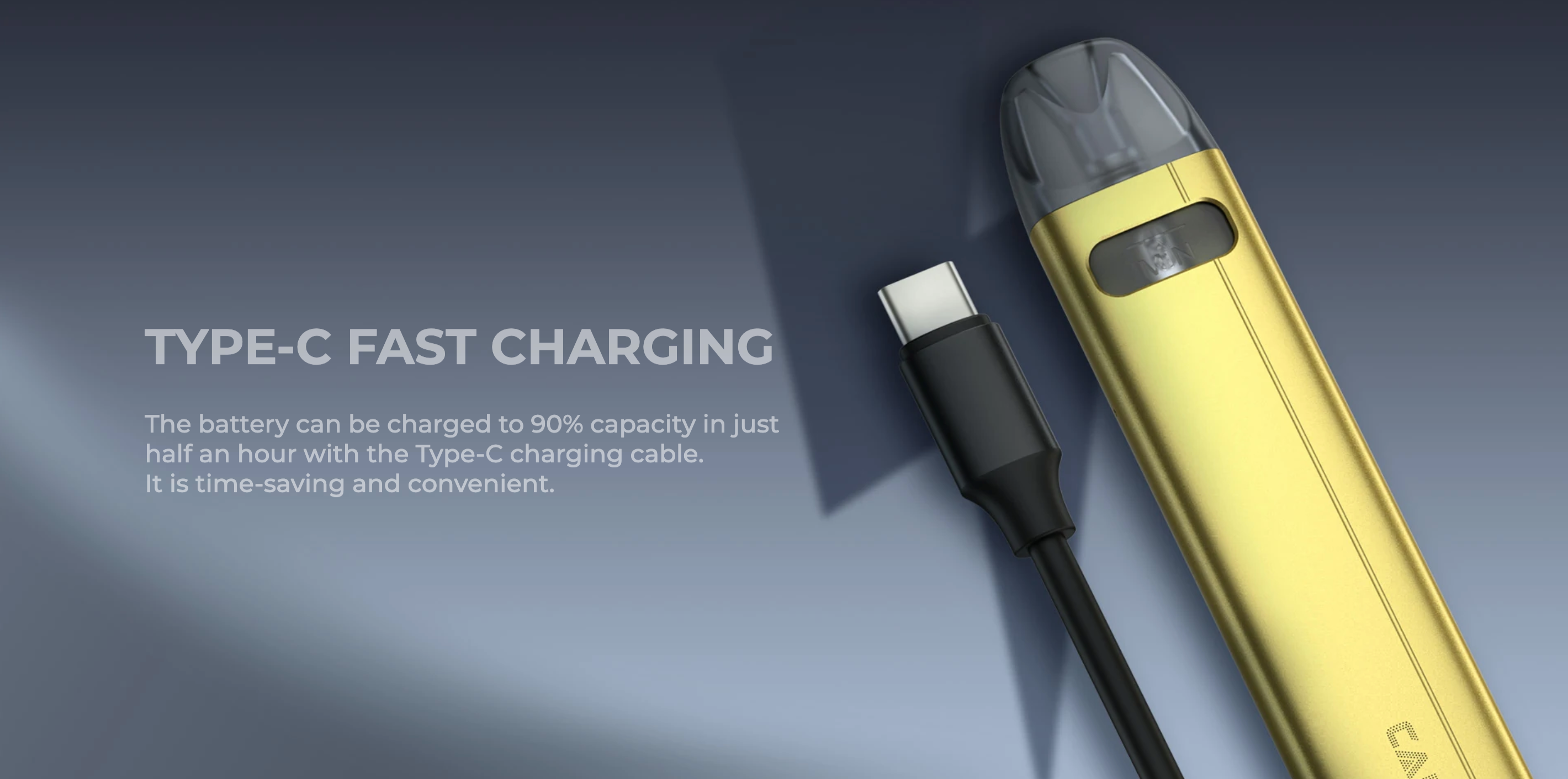 Yeniden doldurulabilir kartuş cihaz için daha fazla kartuş seçeneğine sahiptir. USB Type-C şarj kablosuyla pil sadece yarım saatte %90 kapasiteye kadar şarj edilebilir. Zaman kazandırır ve kullanışlıdır.