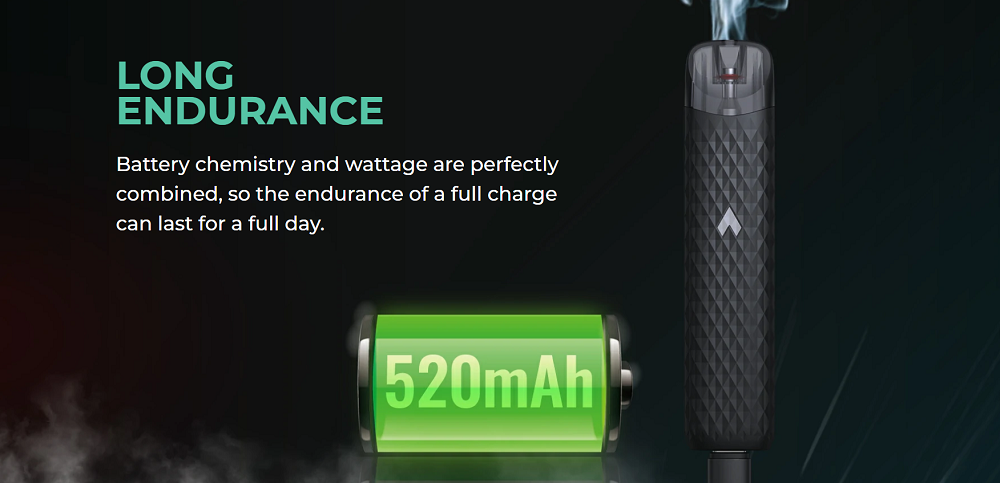 Sadece 27g ağırlığındadır. Ağırlığını elinde hissetmeyeceksin çünkü bir çakmaktan daha hafif. Pil ve watt gücü mükemmel bir şekilde dengelenmiştir, bu nedenle 520mAh kapasitesindeki pil ile tam şarjın dayanıklılığı tam bir gün sürebilir.