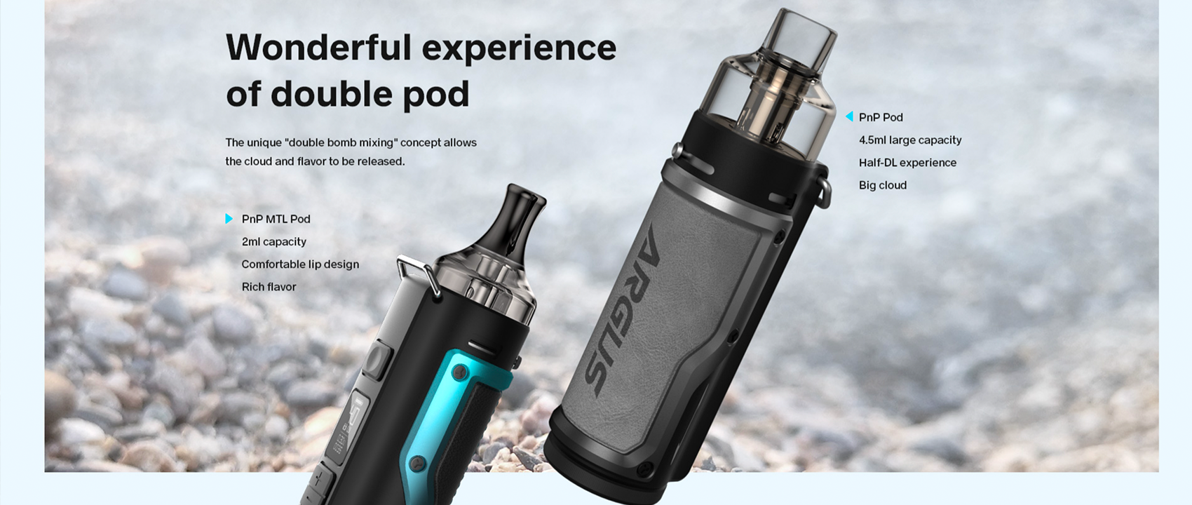 Güçlü ve dayanıklı olmasıyla tanınan Argus serisinin çinko alaşım ve deri gövde ile tasarlanmış yeni cihazıdır. Sağlamlığın yanında oldukça hafiftir. 1500 mAh dahili pile sahiptir. Bu yüksek pil gücü ile gün boyunca keyif yapabilirsiniz. Type-C ile hızlıca şarj edebilirsiniz. Tüm PnP coilleri ile uyumludur.