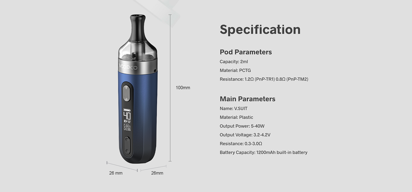 Voopoo V.Suit Pod Mod, 5-40 watt arasında ayarlanabilir çıkış gücü sunan cihaz, 1200mAh kapasiteli dahili bataryası sayesinde uzun süreli kullanım sağlar.